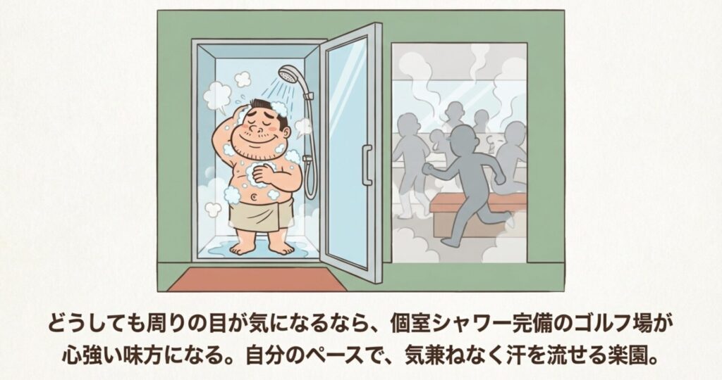 「どうしても大浴場で裸を晒したくない!」という方の救世主が、個室シャワーを備えたゴルフ場です。