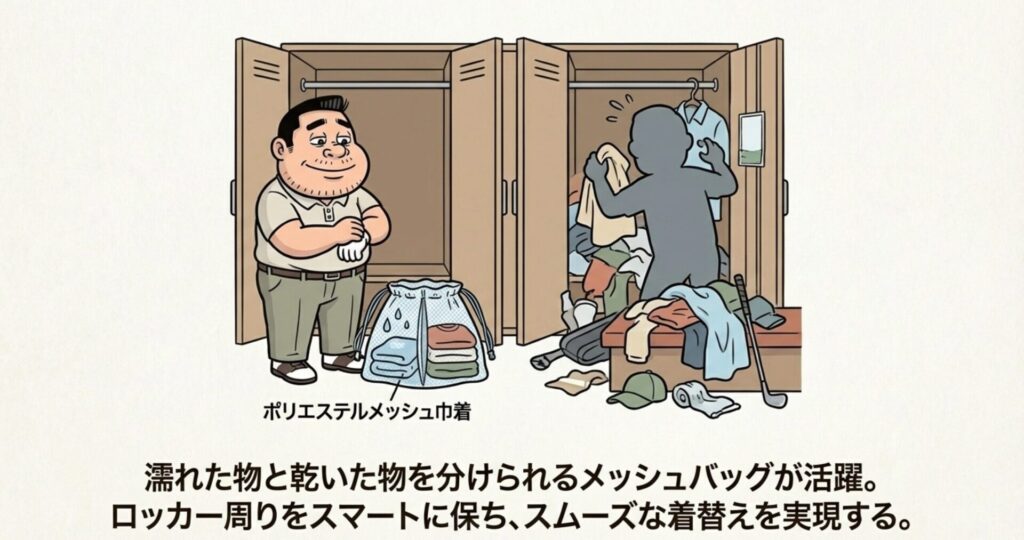 私が特におすすめしているのは、先ほどもチラッと触れたメッシュバッグや、仕切りのあるボストンバッグです。プレー後のウェア、下着、靴下を最初からセットにしておけば、ロッカーでゴソゴソ探す手間が省けます。