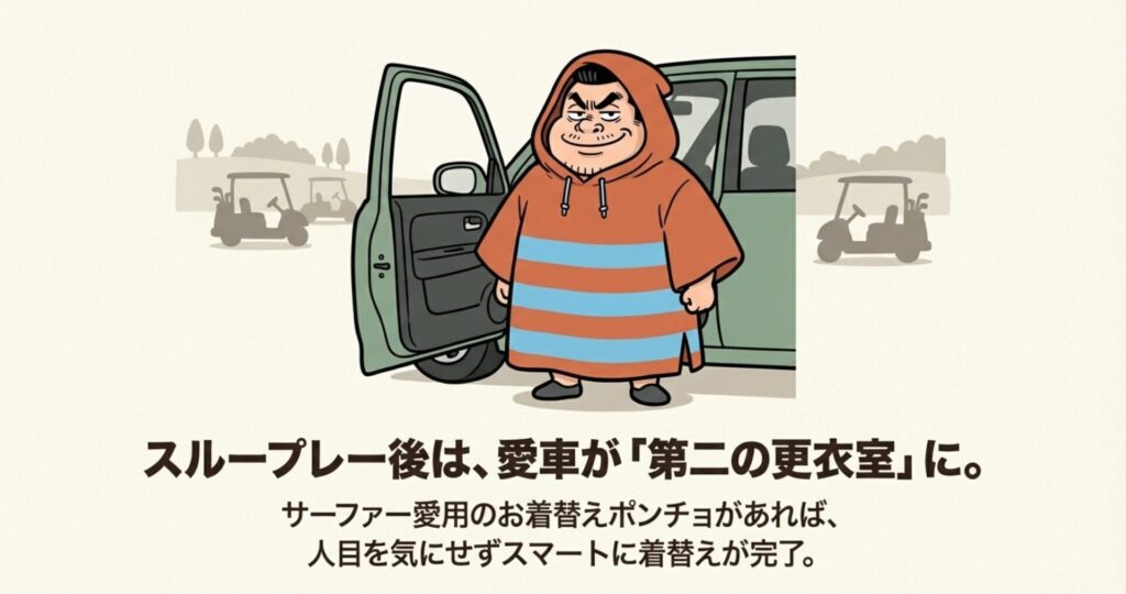 また、もし駐車場でサッと着替えたい場合には、「お着替えポンチョ」が最強の武器になります。元々はサーファーが使うアイテムですが、これがゴルフでも大活躍!