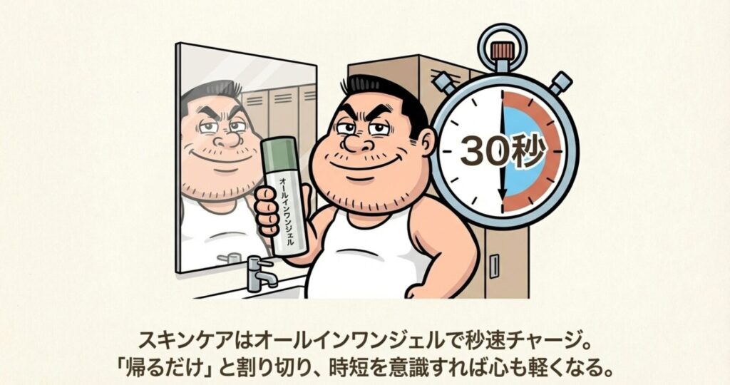 そして、洗顔後のケアはオールインワンタイプを活用しましょう。化粧水、乳液、美容液が一つになったジェルなら、10秒で完了です。最近は男性用の高機能なオールインワンも多いですからね。