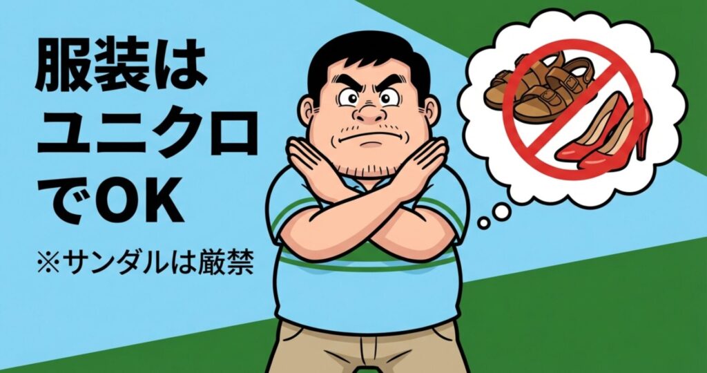 服装ユニクロ等の清潔感ある動きやすい服(サンダル厳禁)