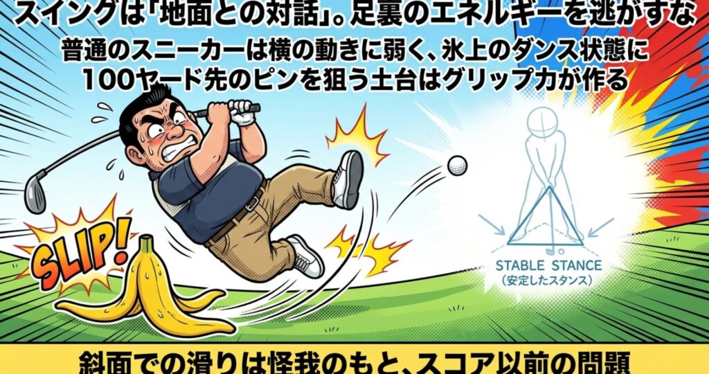 ゴルフは歩くだけのスポーツじゃありません、激しく捻るスポーツなんですわ。あなたが100ヤード先のピンを狙う時、そのエネルギーの源泉は足の裏にあるんですぞ。スニーカーでは、その大事なエネルギーが地面にうまく伝わりません。