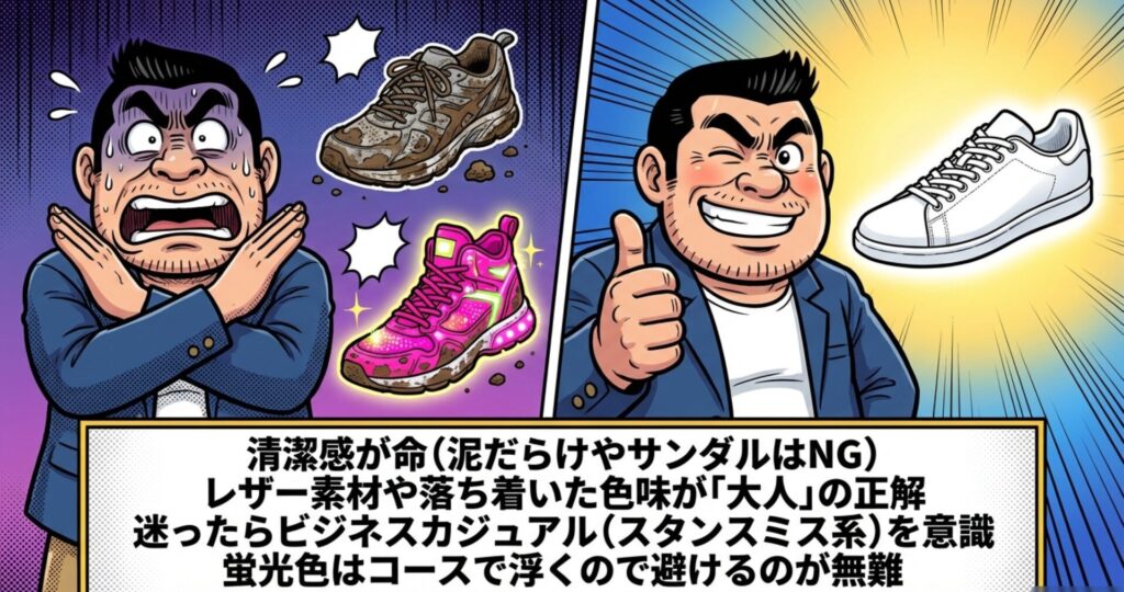 | 行き帰り(来場) | キレイめなスニーカー、またはスパイクレス | 名門コースは革靴必須の場合あり。清潔感が命。 |