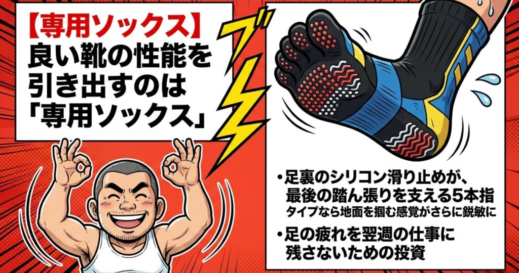 せっかく数万円の最新シューズを履いても、靴下がスーパーで3足1,000円の薄っぺらい綿ソックスじゃ、宝の持ち腐れですわ。