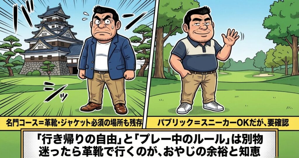 一般的なパブリックコースやセルフプレー主体のゴルフ場なら、スニーカーでの来場が黙認されるケースも多いですが、歴史ある名門コースや高級会員制クラブでは話が別ですな。
