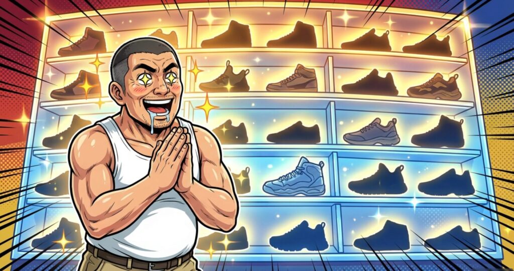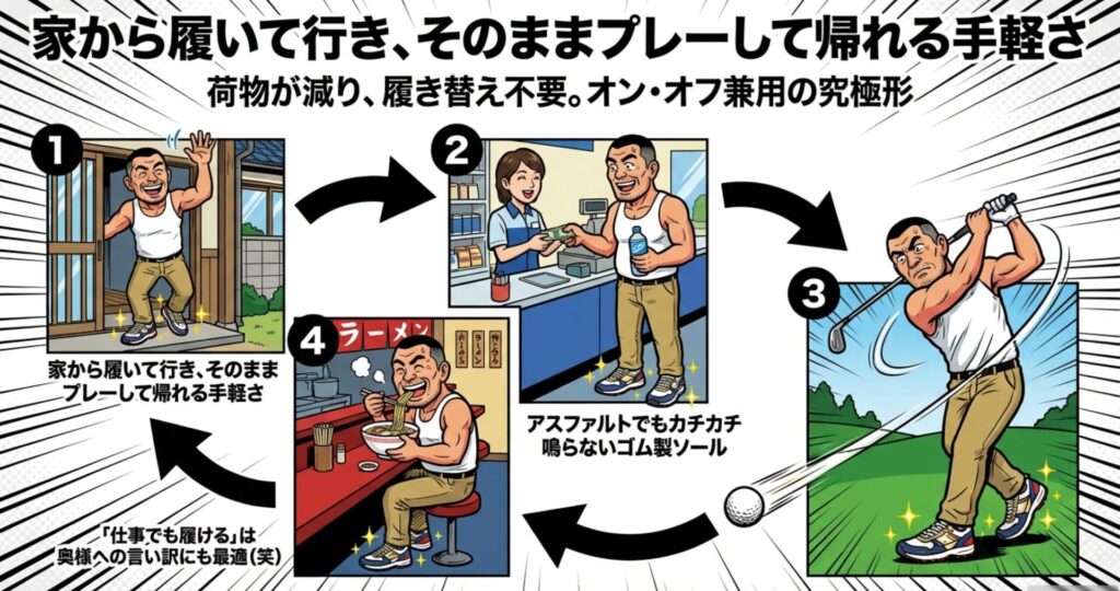 特に最近流行りのスパイクレスシューズなら、見た目は完全なスニーカーなのにゴルフ場の規定にも適合しやすいという、まさに「おやじの味方」的なアイテムなんですわ。