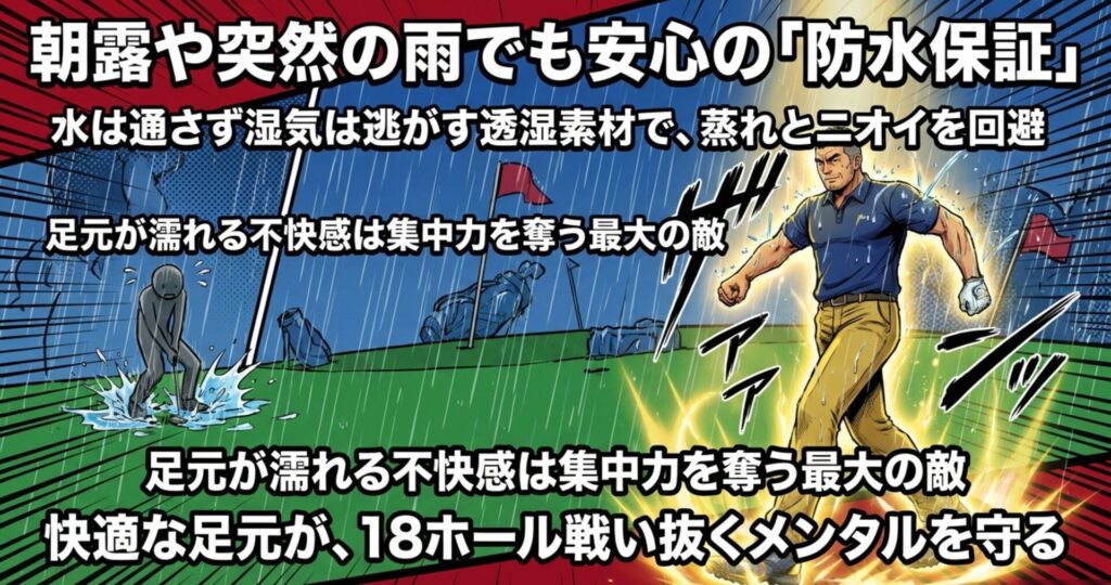 ゴルフを長く続けていると必ず直面するのが「雨」や「朝露」の問題です。朝イチのラウンド、フェアウェイを歩くだけでスニーカーのメッシュ部分から水が染み込んできて、靴下がグチョグチョ……。