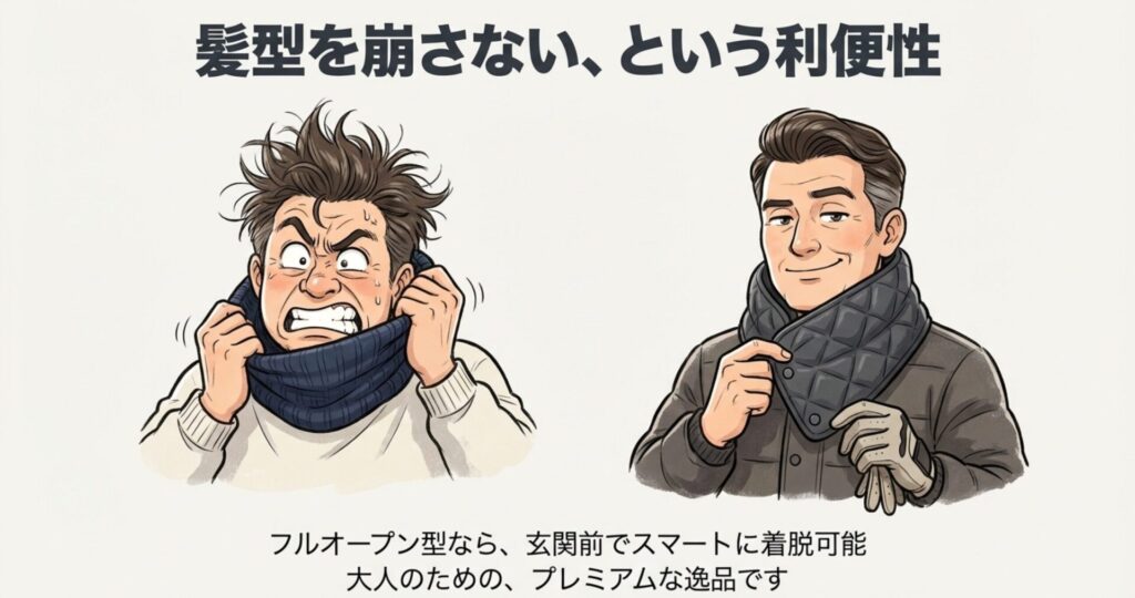 ネックウォーマーをどこかに置き忘れる心配もありませんし、何より「ジャケットとの相性が抜群」なんです。これぞ、大人の賢い選択と言えるでしょう。