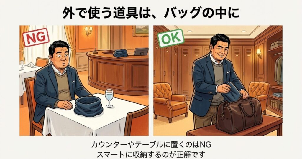 一番ダメなのは、外してそのままフロントのカウンターにドンと置いたり、レストランのテーブルに放置したりすること。これ、実は結構不衛生に見えるし、見た目も美しくありません。
