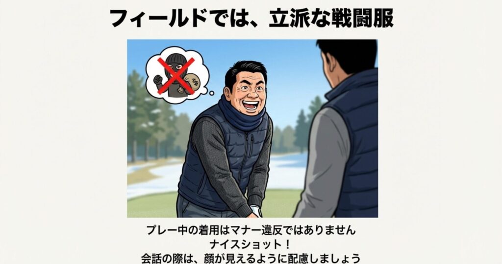 ティーオフからホールアウトまでの間は、ネックウォーマーは立派な「戦闘服」。着用すること自体にマナー違反はありません。