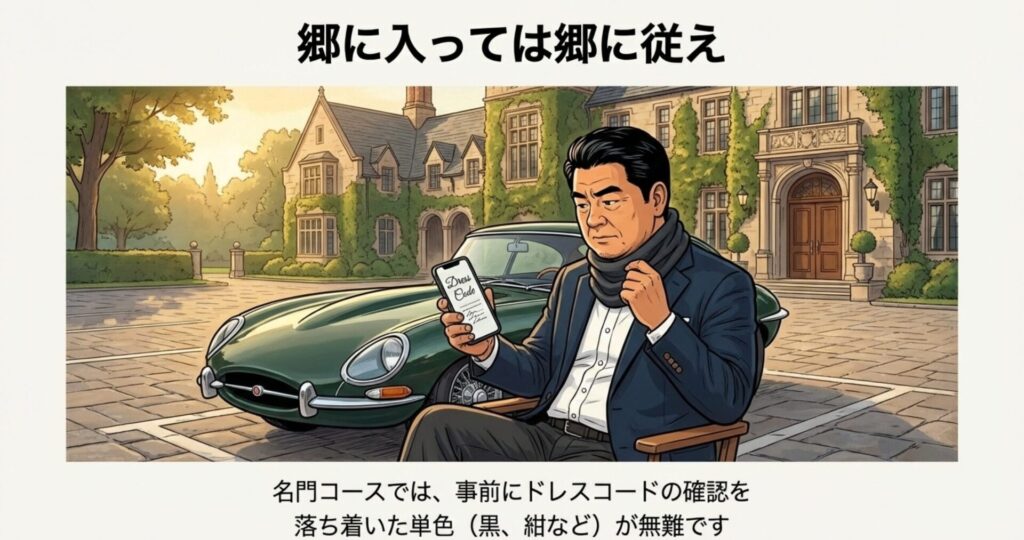 名門コースでは「来場時はジャケット着用」が必須な場合が多く、そのジャケットスタイルにネックウォーマーはまず合いません。玄関で車を降りる前に外して、ボストンバッグに入れてからハウスに入るのが、最もリスクのない「安全な振る舞い」です。