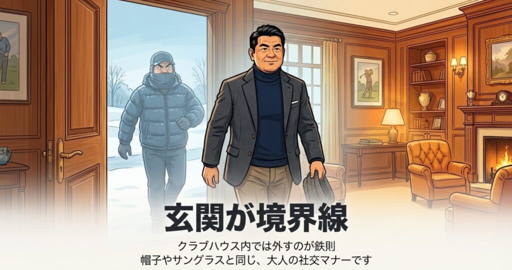 「建物の屋根の下に入ったら防寒具は脱ぐ」というのは、ゴルフに限らず大人の社交マナーの基本中の基本なんですよ。帽子やサングラスと同じ扱いだと考えれば分かりやすいですね。