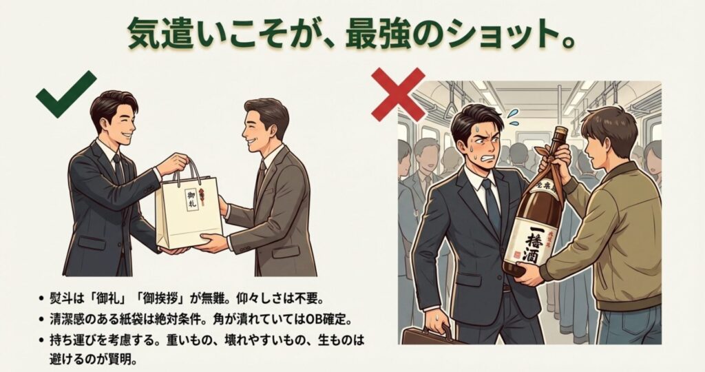 それから、相手が電車で来ている場合は特に注意が必要ですね。重たいお酒の瓶などを渡された日には、帰りの電車で「これ、筋トレかな?」と思われてしまいます。相手の移動手段を事前にリサーチしておくのが、デキるおやじの嗜みというものです。