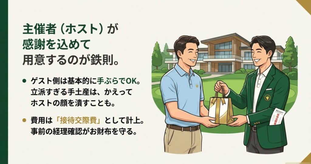 ゴルフの接待は、お呼びしたゲストに一日楽しく過ごしてもらうための場ですので、ホストが感謝の印として用意するのが当たり前です。