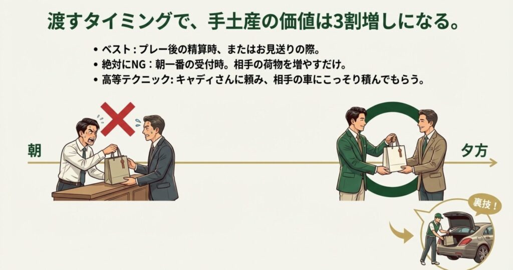 理想的なのは、プレーが終わって、お風呂も入って、さあ帰りましょうかという時に「これ、よろしければご家族でどうぞ」と渡すスタイル。これが一番スマートで、相手の荷物になる時間も最短で済みます。
