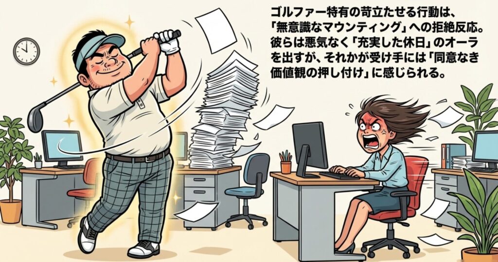街中や職場で、ゴルフバッグをこれ見よがしに運んでいたり、頼んでもいないのにスイングの練習を始めたりする人。そんなゴルファーを見るとむかつくという感情、これは一種の「無意識なマウンティング」に対する拒絶反応でしょうな。