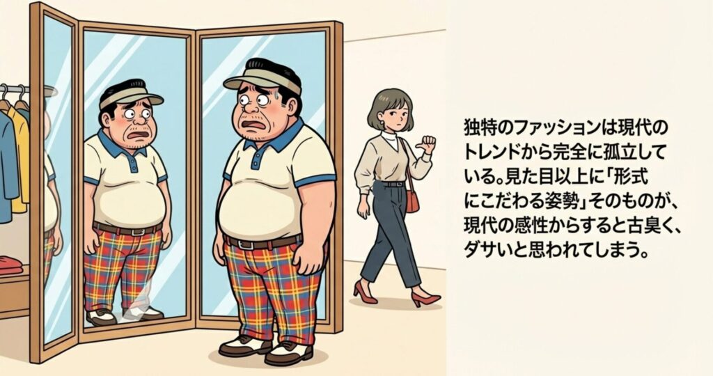 あの独特の派手なチェック柄、不自然なまでにパツパツのポロシャツ、そして「おじさん専用」と言わんばかりのデザインの帽子……。