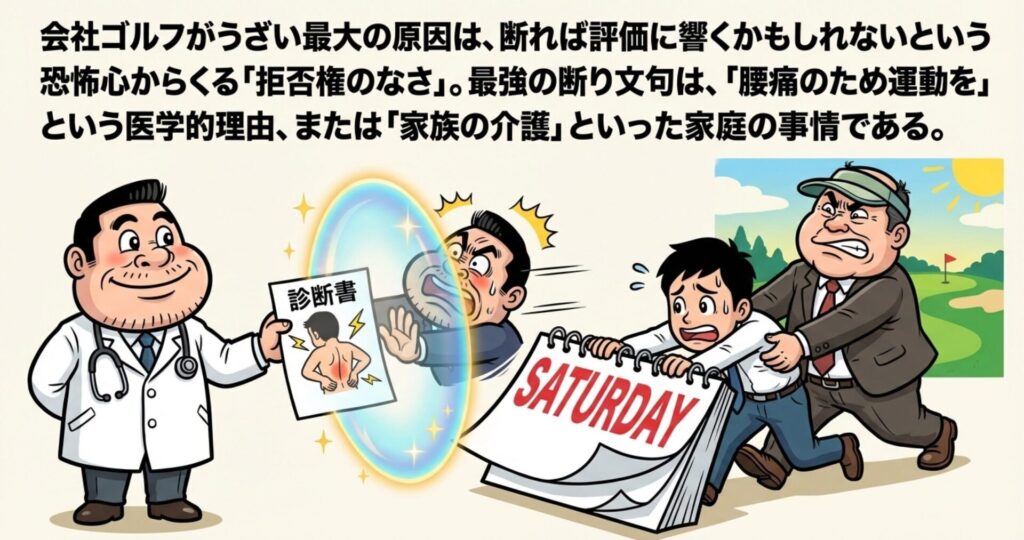 会社のゴルフがうざい時の最強の断り文句は、「医師から腰痛のため過度な運動を止められている」という医学的理由、もしくは「実家の介護の当番が土日に入っている」という家庭の事情です。これらは上司も踏み込みにくく、角を立てずにフェードアウトできる王道の手段ですわ。