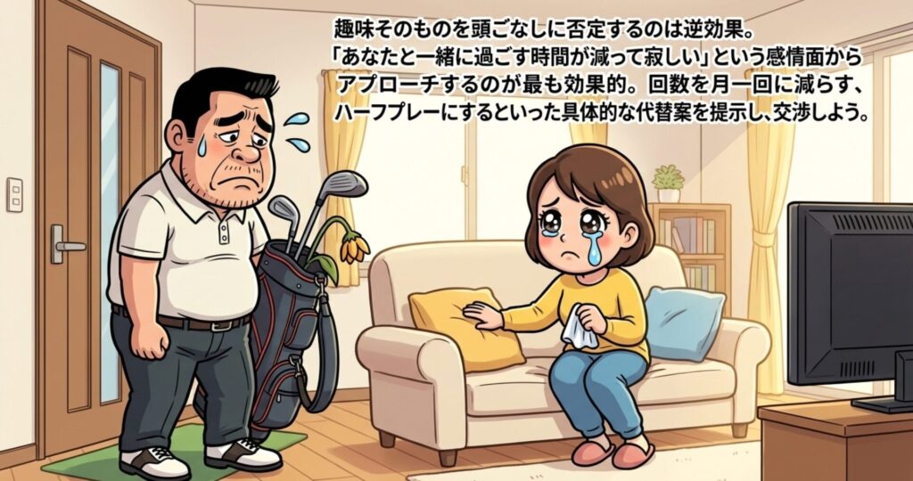 しかし、男性にとってゴルフは「逃避」であり「誇り」でもあるため、頭ごなしに否定するのは逆効果。