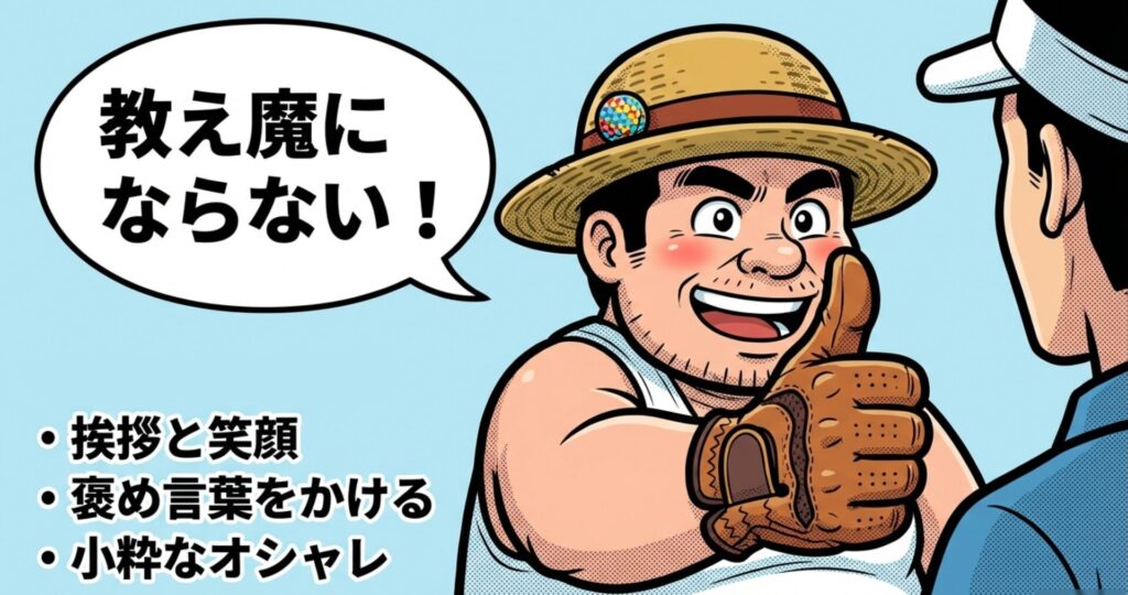 「あんた、その構えじゃダメだよ」なんて言うのは、相手から求められた時だけにするのがおやじの粋ってやつです。自分からは「ナイスショット!」と声をかける。これだけで人間関係はバラ色です。