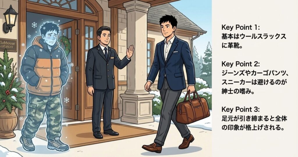 足元は、スニーカー不可のクラブが多いため、迷ったらローファーやストレートチップの革靴を履いていきましょう。足元が締まっているだけで、全体の印象は驚くほど「紳士」に仕上がりますよ。