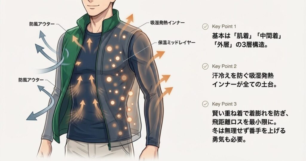 特に「腕周りは薄く、体幹は厚く」を意識すると、スイングのキレが冬でも落ちませんよ。