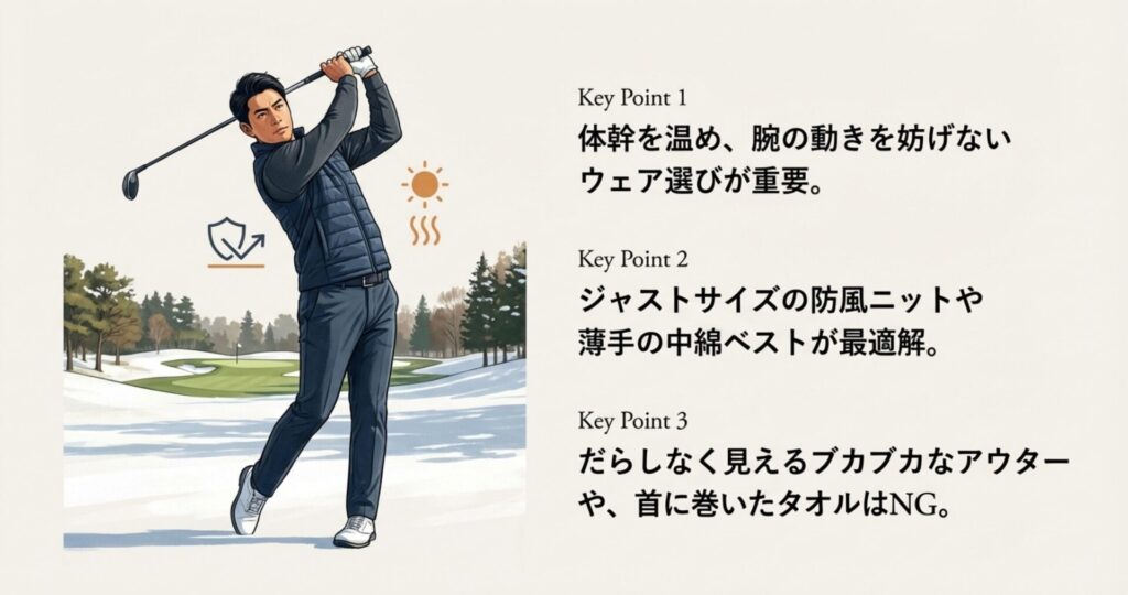 風を遮るウインドブレーカーやベストは必須ですが、あまりにブカブカなものはスイングの邪魔になるだけでなく、だらしなく見えてしまいます。ジャストサイズの防風ニットや、薄手のダウンベストを活用しましょう。