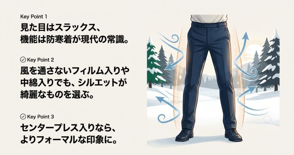 今のトレンドは「防風スラックス」です。見た目は普通のスラックスなのに、裏地にフィルムが貼ってあって風を通さない。これが最強です。